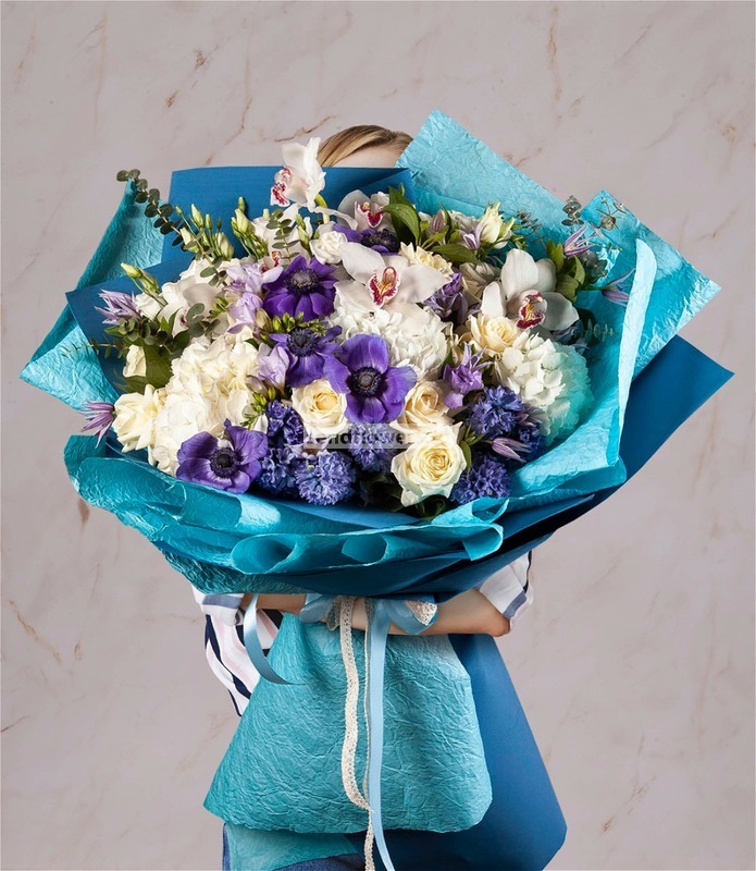 Состав: Салал (25), Эвкалипт (5), Лента натуральная (5), Клематис (5), Лента натуральная (декоративная) (5), Орхидея Цимбидиум белый (5), Фрезия сиреневая (7), Эустома белая (7), Роза белая (10), Анемон синий (5), Гиацинт синий (7), Фоамиран (3), Бумага жатая влагостойкая (5), Гортензия белая CO (3)